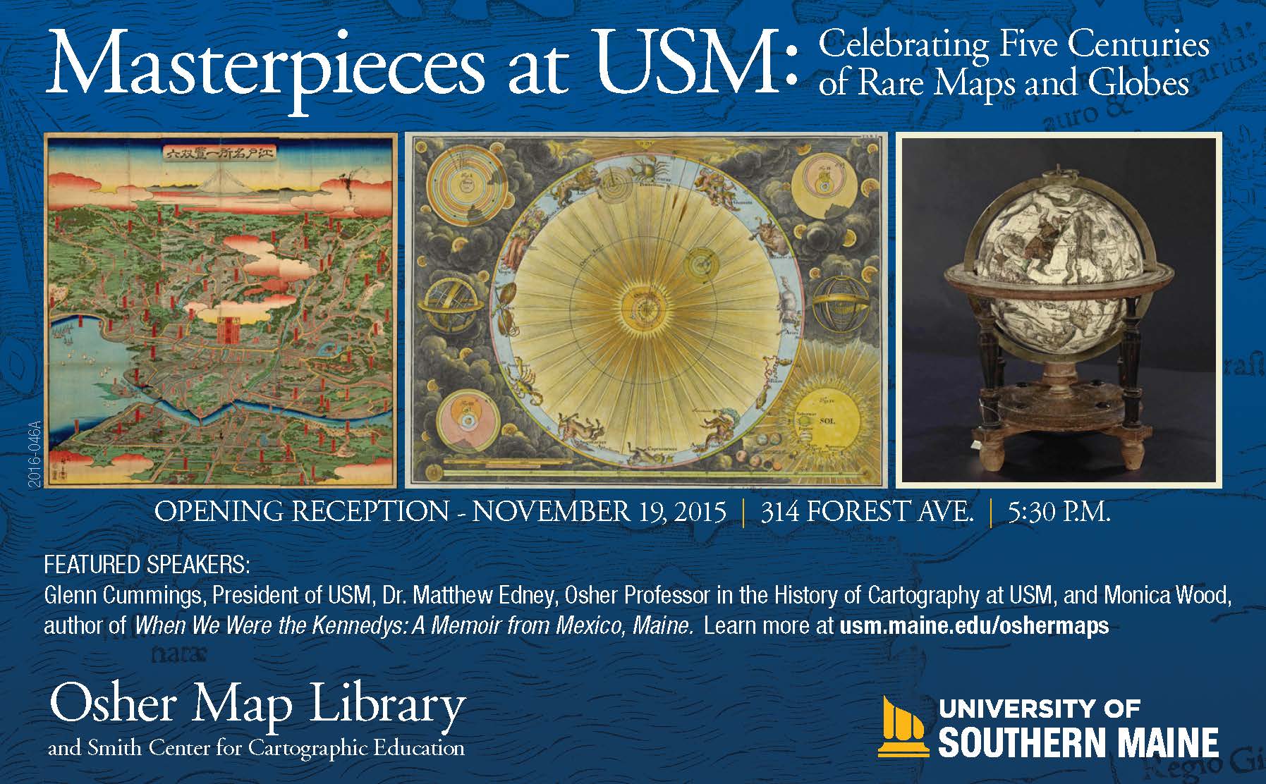 Curated by the OML staff and some of Maine’s very own luminaries, including renowned authors Susan Minot and Monica Wood as well as Senator Angus King, Senator Susan Collins and Congresswoman Chellie Pingree, among others, this engaging exhibit highlights masterpieces from OML collections. Featuring monumental pieces of cartographic history from around the world, ranging from the first modern printed map in 1475 to superb examples of woodcut, copperplate, and lithographic map printing from the 15th through the 19th centuries. We invite you to come and see some of the rarest and most beautiful maps, atlases, and globes in the world and to hear what Maine notables have to say about their favorite pieces from our collection.