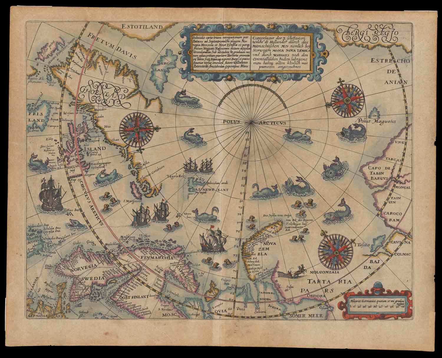 In the late-16th century, Dutch cartographer and navigator Willem Barentsz led three voyages to the Northern regions, in search of a northeast passage. Continually thwarted by ice, on the third voyage (1596-1597) the crew had to shelter on an exposed bluff, where they built a hut out of driftwood and lumber from their ice-encased ship. Continually under attack by polar bears, they survived on the arctic foxes they trapped and provisions from the ship. Stuck for nearly a year, the crew set off on the open boats the following June, and were, many weeks later, rescued in the Kola Peninsula (Barentsz having perished at sea prior to the rescue). Barentsz’s map of the Arctic regions includes: Greenland, Iceland, northern Scandinavia, northern Russia, and northern North America, as well as the routes of his third voyage from 1596-1597. This map of otherwise very real places is included in this exhibition both for its fantastical illustrations of monstrous looking sea creatures (most of which are whales), and the inclusion of the island of Frisland (placed near Iceland), a phantom island that appeared on maps of this region for nearly a century.
