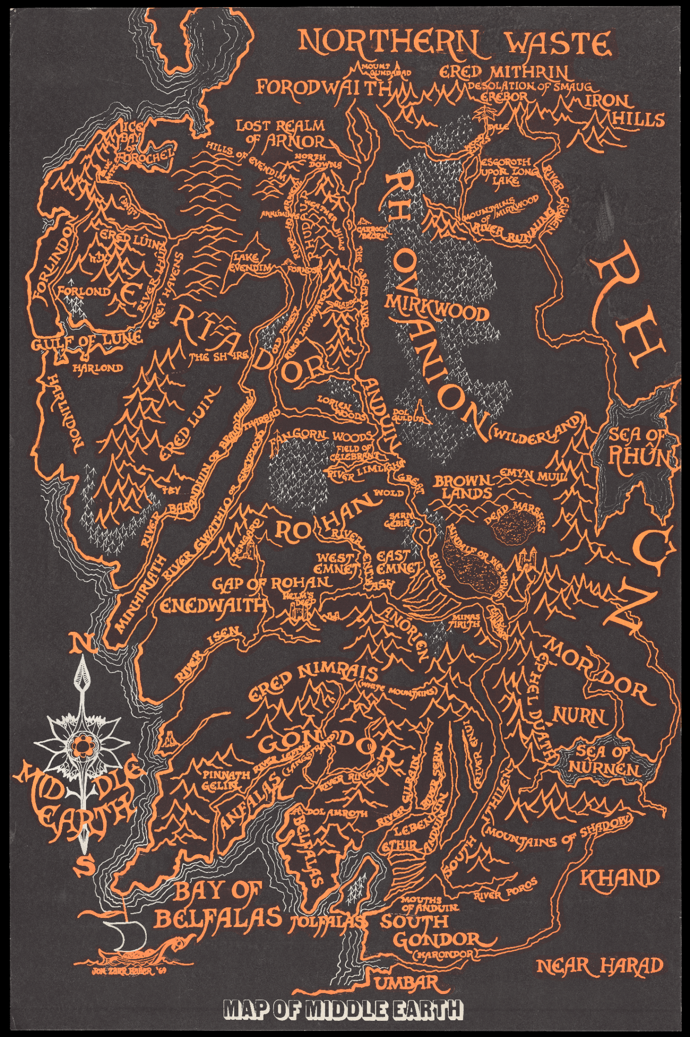 When Ballantine Books published The Lord of the Rings trilogy in paperback in the United States in 1965, J.R.R. Tolkien’s fantasy world quickly gained a cult following among West Coast hippies and readers more generally. Graphic artists seized the opportunity to make their own versions of Tolkien’s famous map of Middle-Earth. Jon Zarr Haber produced this black light poster at the height of the counterculture movement. He squeezed Tolkien’s map to fit the dimensions of the poster, creating a distorted Middle-Earth. Bilbo’s Shire is difficult to find within the confines of Eriador. But, like the one ring’s inscription, the map glows if viewed in the proper lighting and situation.