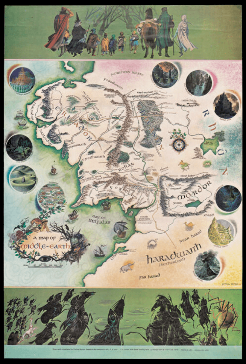 This map depicts the particular areas described in Tolkein’s novels The Hobbit and The Lord of the Rings, and significant scenes from The Lord of the Rings are illustrated in circular insets on the map. The map is bordered on the top by the ring bearing characters in The Lord of the Rings and on the bottom by those character’s adversaries. Lighter colored ships are Elven vessels while the darker ships were either from Gondor or other areas. According to Tolkien, the map represents an area of about 1400 miles long from The Shire, what Tolkien believed to be the latitude of Oxford, England, and the bottom of the map, which Tolkien believed to be about the latitude of Israel’s capital city of Jerusalem.