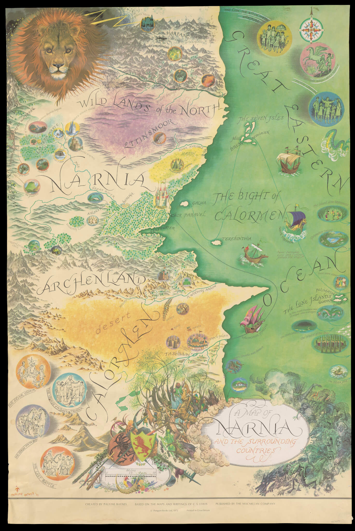 C. S. Lewis (1898–1963) taught English literature at Oxford University, where he was a member of the Inklings, alongside J. R. R. Tolkien. Having fallen away from Christianity as a youth, he returned to the Anglican church in his 30s and he used a variety of fantastical stories to proselytize his faith. He is especially remembered today for his series of seven books set in Narnia, beginning with The Lion, the Witch, and the Wardrobe (1950), with the consistent theme of innocence triumphing over evil. The first editions of the Narnia chronicles were all illustrated by Pauline Baynes (1922–2008), who created this map as a poster in 1972.