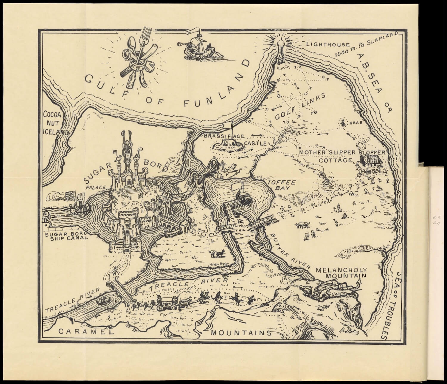 Butter-scotia is part of a Victorian era fantasy series by the English Judge and dramatist Edward Abbott Parry that centers on children traveling to fantastic lands. A sequel to Katawampus: Its Treatement and Cure, this title is regarded as a less-psychedelic version of Lewis Carroll’s 1865 novel Alice’s Adventures in Wonderland. A tipped-in map of Butter-Scotia (a play on the word butterscotch) is included at the beginning of the novel, and, as one might imagine, depicts an imagined land filled with places and geographical features named after treats that would have appealed to Victorian-era British children, including: Caramel Mountains, Treacle River, Toffee Bay, and Cocanut Iceland to name a few. Like many maps drawn to accompany fictional narratives, the imagined landscapes mirror real-life (to a certain extent), with golf links, lighthouses, castles and cottages dotting the landscape, just as they would have in rural England.