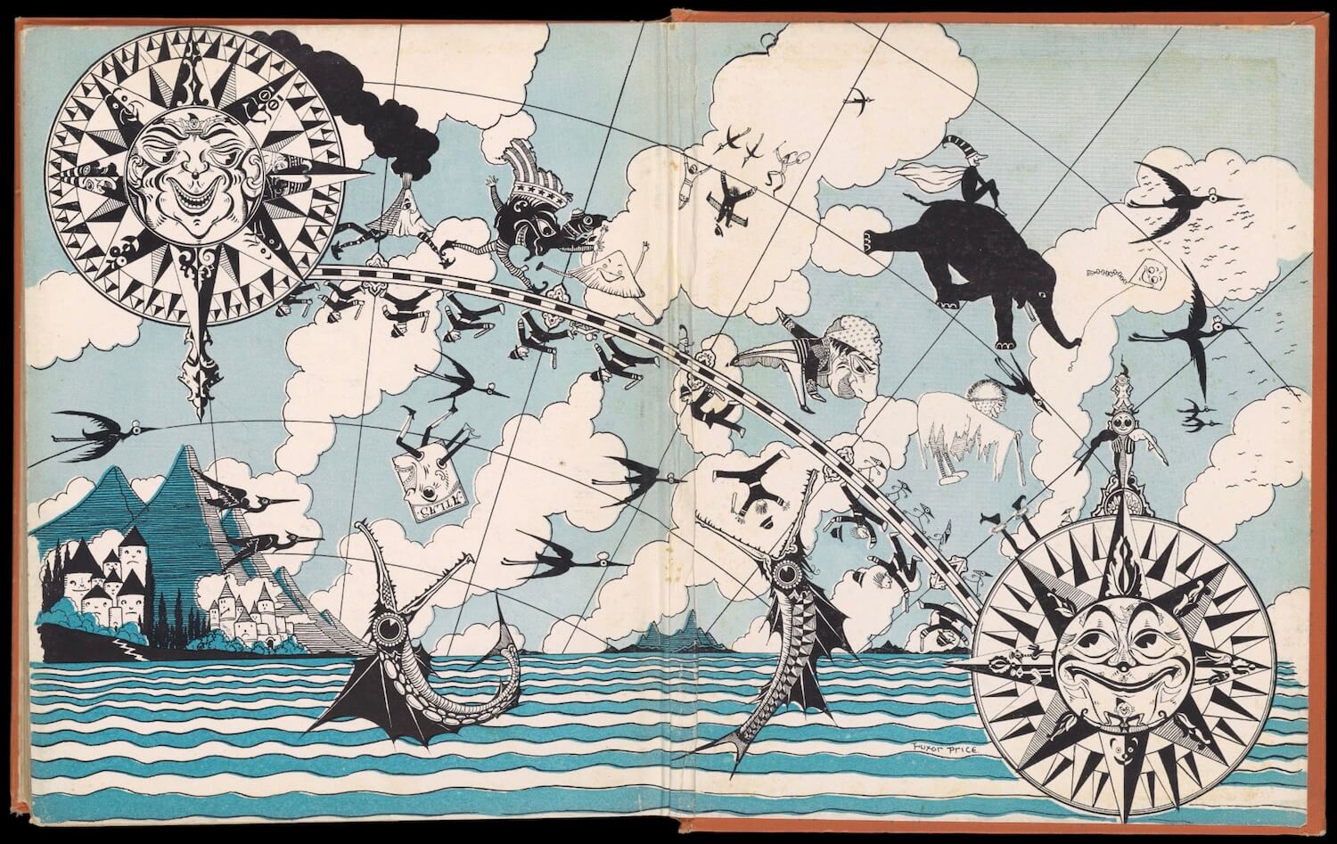 The endpapers of The Magic Map are strikingly illustrated to showcase the bold and enchanting map elements at the heart of this unique geographical fantasy. Much like Alice avoiding her studies and dreaming away to Wonderland, young David, the main character, lazily procrastinates with his geography lesson at the start of The Magic Map. What ensues is an otherworldly journey through a cartographic dreamscape that educates young readers about the rudimentary concepts of geography in fantastical fashion–the author’s attempt to make the study of geography as fun and educational as travel itself. Price, a self-taught Welsh-born illustrator who lived and worked in New York, illustrated numerous books by Bonner, including the related titles Magic Journey (1928) and The Magic Universe (1930).