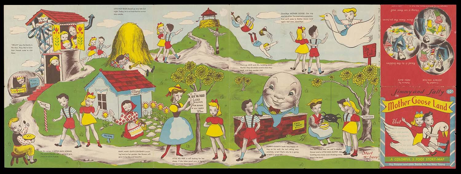Advertised as a “colorful 3 Foot Story-Map,” Jimmy and Sally in Mother Goose Land was sold for ten cents a copy at the end of World War II. The map included visual instructions for parents, who could “Read it to the kiddies,” “Show them the pictures,” or “Hang it on their wall.” These instructions, along with the title, could be cut off of the map if the user desired, so only the narrative would remain visible. The literal story-map begins on the lower right, where Jimmy and Sally stand on a path in front of a tree marked “Start Here,” and winds through a series of encounters with Mother Goose characters who would have been very familiar to many American children. Humpty Dumpty, Little Bo Peep, Mary, Mary, Quite Contrary, Little Jack Horner, Little Boy Blue, Jack and Jill and others are met along the road, with the Victor’s text offering children brief moral and behavioral lessons and reminders at each stop (e.g. finish all of your food, take good care of your things, work hard, share with your friends, go to bed early, etc.). Mother Goose Land was also the subject of a popular Betty Boop cartoon short in 1933 where, notably, the characters come to life–just as they do on this story map.