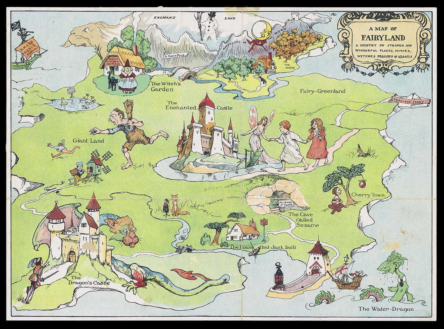 The characters and settings of L. Frank Baum’s children’s novel, The Wonderful Wizard of Oz, first published in 1900, continues to entrance readers today, and, alongside the famous films, to inspire artists to make maps of Oz. This relatively recent example appeared just a year after Disney’s theatrical release of “Return to Oz,” the unofficial sequel film to the 1929 Metro-Goldwyn-Mayer classic, “Wizard of Oz.” Like the 1920s Map of Oz displayed elsewhere in the exhibition, Martin’s map displays the four quadrants of Oz (Gilliken Country in the north, Quadling Country in the south, Winkie Country in the west, and Munchkin Country in the east), as well as the Emerald City, Glinda’s Palace, Wogglebug College, the Shifting Sands, and Great Sandy Waste. The night sky and title scrolls echo those found in Jaro Hess’s masterful map of the Land of Make Believe.