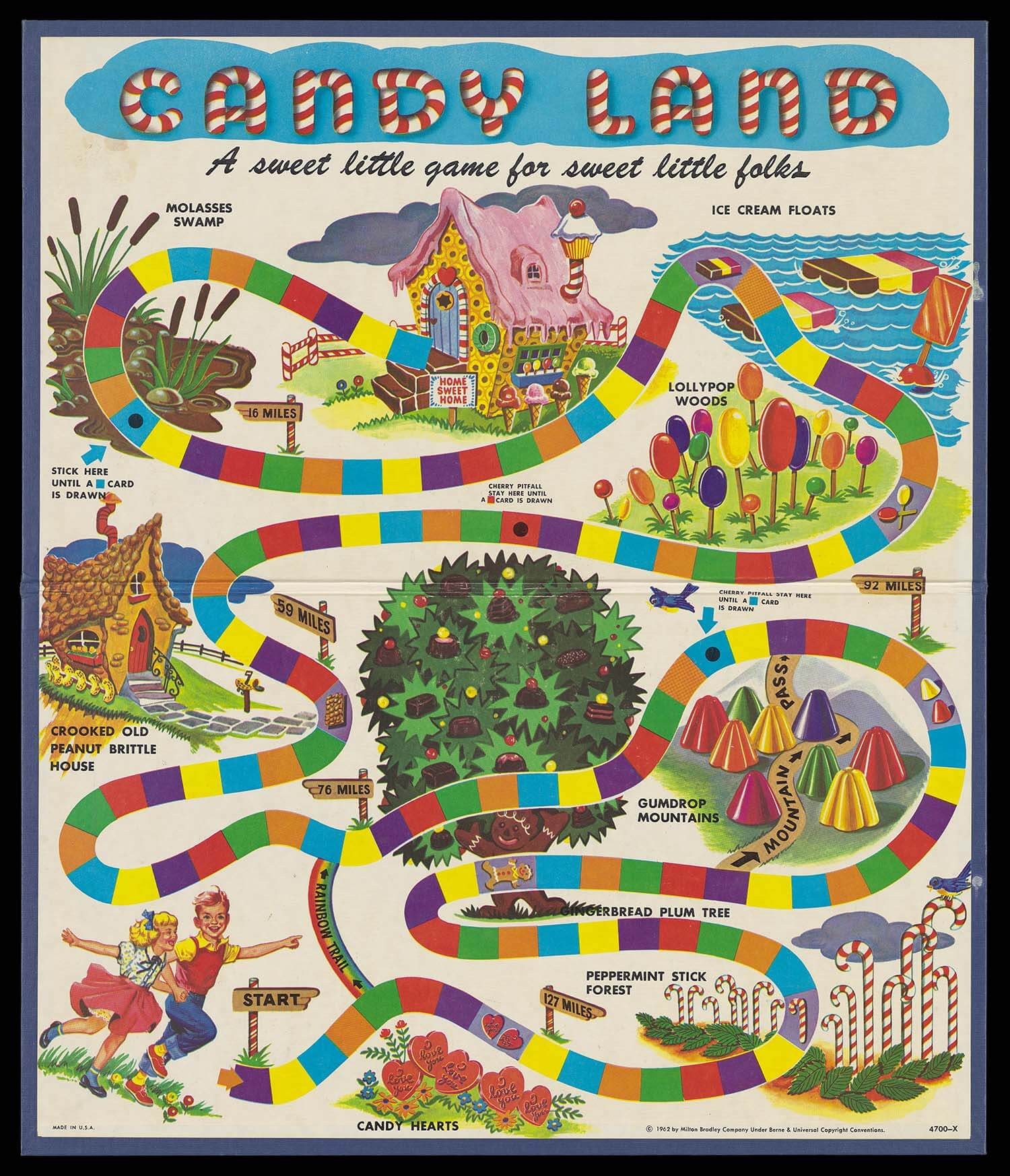 Game boards like Candy Land can also serve as fantasy maps. Similar to other fantasy maps in the exhibition, two children travel down a colorful road that leads them “home” only after they have faced various obstacles such as the Candy Cane Forest, cherry pitfalls, and the Molasses Swamp. It may surprise some viewers to learn that this seemingly ubiquitous childhood game was, in fact, the result of the polio pandemic of the 1940s. Eleanor Abbott, a California school teacher, was recovering from a bout of polio in the children’s ward of a San Diego hospital when she first developed the game in the hopes of easing boredom and bringing cheer to her fellow patients. Quarantined children sometimes spent months in the hospital recovering from polio, where they were confined to their beds hour after hour, waiting for or receiving treatments in the iron lungs that lined the wards. In a world where nearly every movement of a child was restricted, Candy Land allowed them to move forward unencumbered (and play again, and again) with luck and chance guiding the way. Abbott pitched the game to Milton Bradley, and it quickly became their most successful title. Although the design of the board has changed slightly over the years, the rules of the game are remarkably similar to the original version, and Candy Land, now owned by Hasbro, still sells millions of copies each year (and still entertains children in pandemic quarantine and isolation).