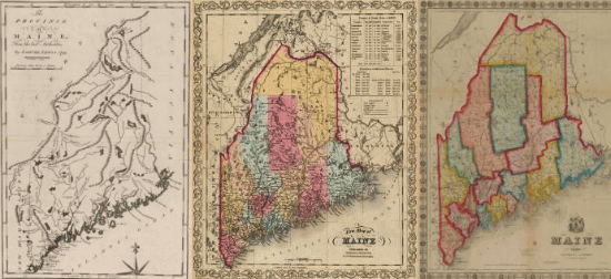 The most persistent atlas map of antebellum Maine was A New Map of Maine, which appeared in twenty-eight variants between 1833 and 1860: a remarkable number. Henry Schenck Tanner, a prominent Philadelphia map publisher, created it for his [New] Universal Atlas (published in sections from 1833, then as a single work from 1836) [map 18]. A variety of other Philadelphia publishers issued the atlas after 1842. In 1846, S. Augustus Mitchell took Tanner’s name off the map and added his own, during a failed experiment in color printing [24, in the central floor case]. Further issues of the map continued to appear with updated content and bearing various publishers’ names [19-23].