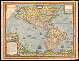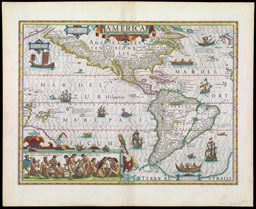 This map by one of the greatest Dutch cartographers of the sixteenth century presents the most advanced European view of America as the centennial of the Columbus landfall approached. The continental outlines have been improved, especially that of South America. Spanish and French settlements are shown in detail, along with what is probably the first appearance of Chesapeake Bay on a printed map. Several new place names have been added including the first appearance on a printed map of "C. Mendocino" on the California coast. The region and city of "Norumbega" are again seen. At the northern border a body of water resembling Hudson Bay is depicted more than twenty years before Henry Hudson's exploration. Here again, the explanation may lie in a Native American source or an unrecorded European voyage. The mythical antarctic continent persists, apparently uninhabited.