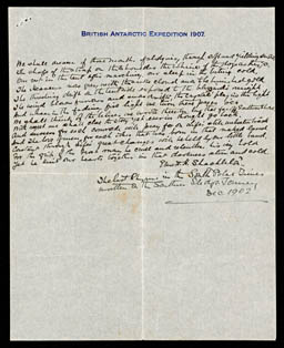 This map serves as an overview of Shackleton’s Antarctic Expedition, including the routes taken by the Nimrod and the route that Shackleton pioneered party towards the South Pole. Shackleton added the routes of other explorers to put his journey into context.