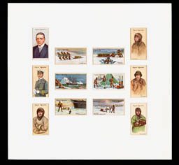 The eagerness with which the public followed the exploits of the polar explorers is shown by these collectible cards distributed by Player’s Cigarettes. The colorful chromolithographic illustrations were based on actual black and white photographs.