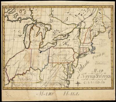 Emily Hill constructed this huge manuscript map from six linked sheets of paper. Geography was often taught to children by having them draw maps in order to learn about latitude, longitude, borders, and locations of places, but because of its size, it is likely the work of a teacher rather than a student. The map is derived from one of the many versions of Abraham Bradley's Map of the United States, Exhibiting the Post-Roads. Interestingly, it has mispellings: look for one in New England, and another near New York City. The map is decorated with a floral wreath design similar to those found in contemporary penmanship manuals from Vermont.