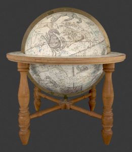 Market demands led many globemakers to draw the constellations on their celestial globes incorrectly, facing outwards, to show a more attractive figure to the viewer. This was the case with a globe made in London in about 1810 by Charles Smith, which was later copied by Josiah Loring in Boston in 1832. Globe #14is a later version published in 1854, largely unchanged from Smith’s original.