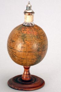 This globe (#28) is from the Chicago World’s Fair of 1893. In the center, it holds a glass perfume bottle and the “World’s Fair Perfume,” made by Hermann Tappan Perfume.