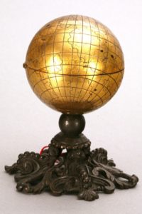 This novelty globe (#34) opens in halves to reveal an glass inkwell inside. Made in 1852, the inkwell globe is mounted on an elaborate iron base. It does not actually show the continents of the Earth. Instead, it seems to be an imaginary planet, making it the perfect ornament for the desk of a fiction writer.