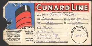 A tourist-class baggage tag from Judith’s return voyage to the United States. Her room number is listed as R-44.